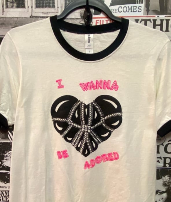 I wanna be adored in hot pink and black on a Soft cotton off white ringer tee. Hand screen printed and designed by Death Valley Ltd