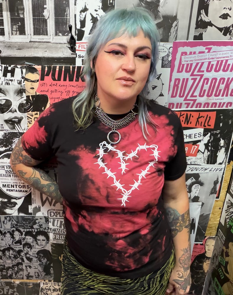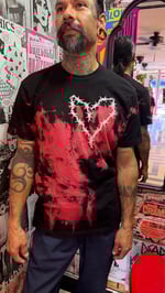 Red and black dyed shirts with puff ink printed barbed wire heart design. *Natural Variations in color effects due to process not one shirt is the same. Hand printed by Death Valley Ltd.