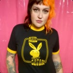 Select between the ringer or plain black tee with yellow print. The poly cotton blend black and yellow ringers are soft and comfy to wear with no shrinkage. Hand screen printed Hail Satan designed by Death Valley Ltd.