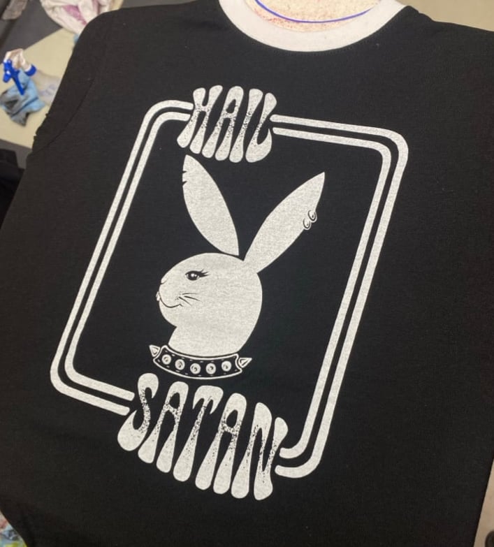 Choose between a ringer or plain black tees for this classic white Hail Satan print