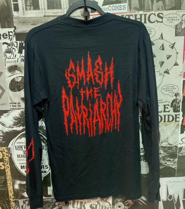 Solid Black long sleeve with red Smash the Patriarchy print. Printed front and back. Hand screen printed and designed by Death Valley Ltd