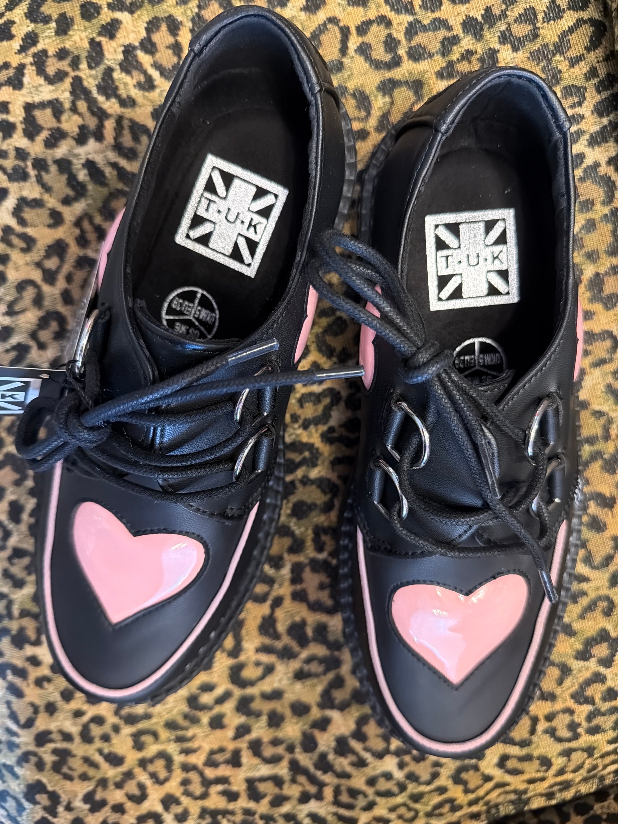 Features a black upper with pink hearts, lace-up fastening, and our lightweight VIVA mondo sole that is approximately 1 ¾” at the heel and 1 ¼” in the front. Has removable memory foam padding for added comfort. Shoe can be easily cleaned with mild soap and water.